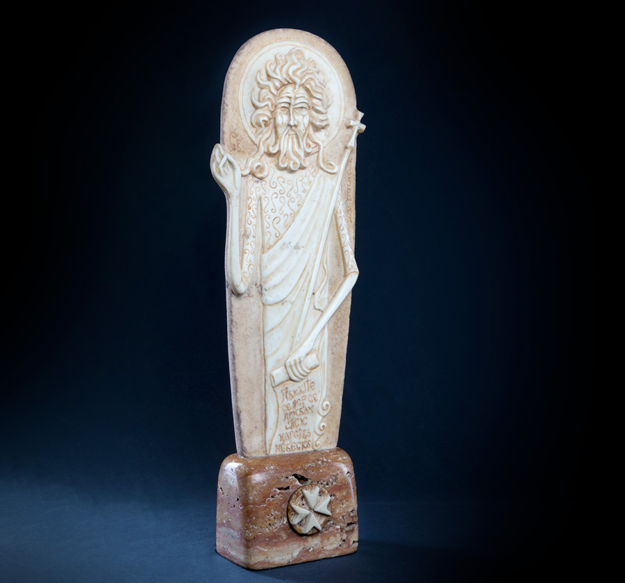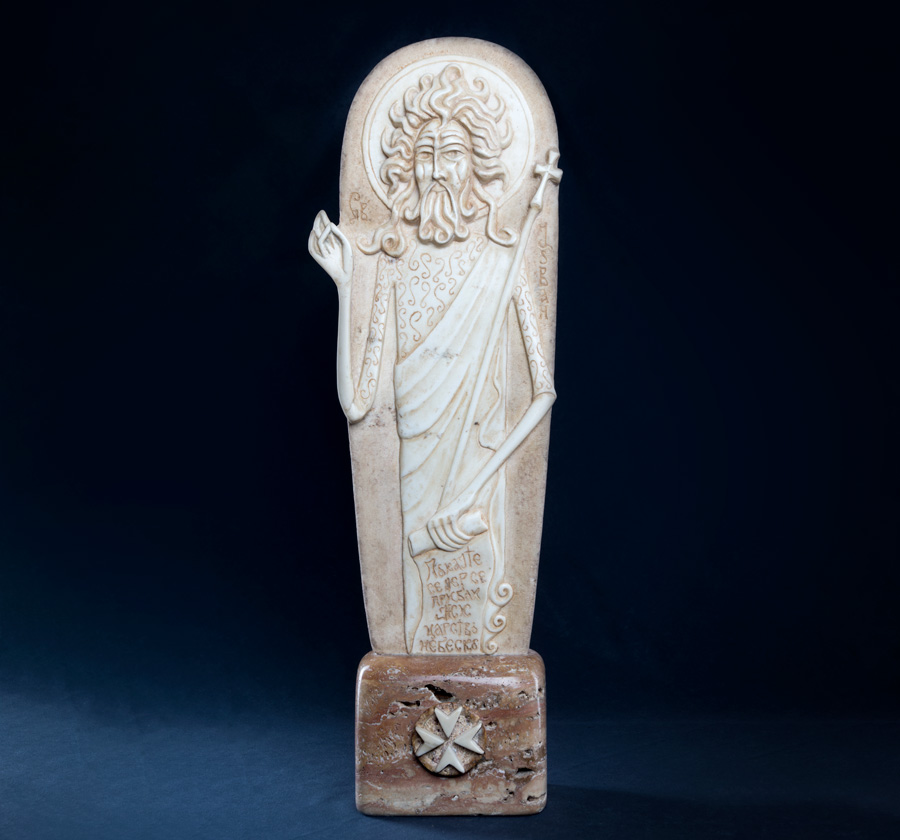 This magnificent energy and the way it influences the family have inspired the artist to start exploring Byzantine iconography. Mateja has created his first Byzantine icon in ba-relief, the icon of Jesus Christ. In the following years Mateja continued crafting icons in different kinds of marble and inbreathing a subtle artistic note to each, while perfecting his craftsmanship at the same time. This is when many of his marble icons were created: Jesus Christ, St. Nicholas, St. Peter and Paul, St. Michael, St. Gabriel, St. George, The Virgin Mary, etc.